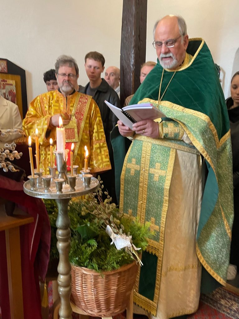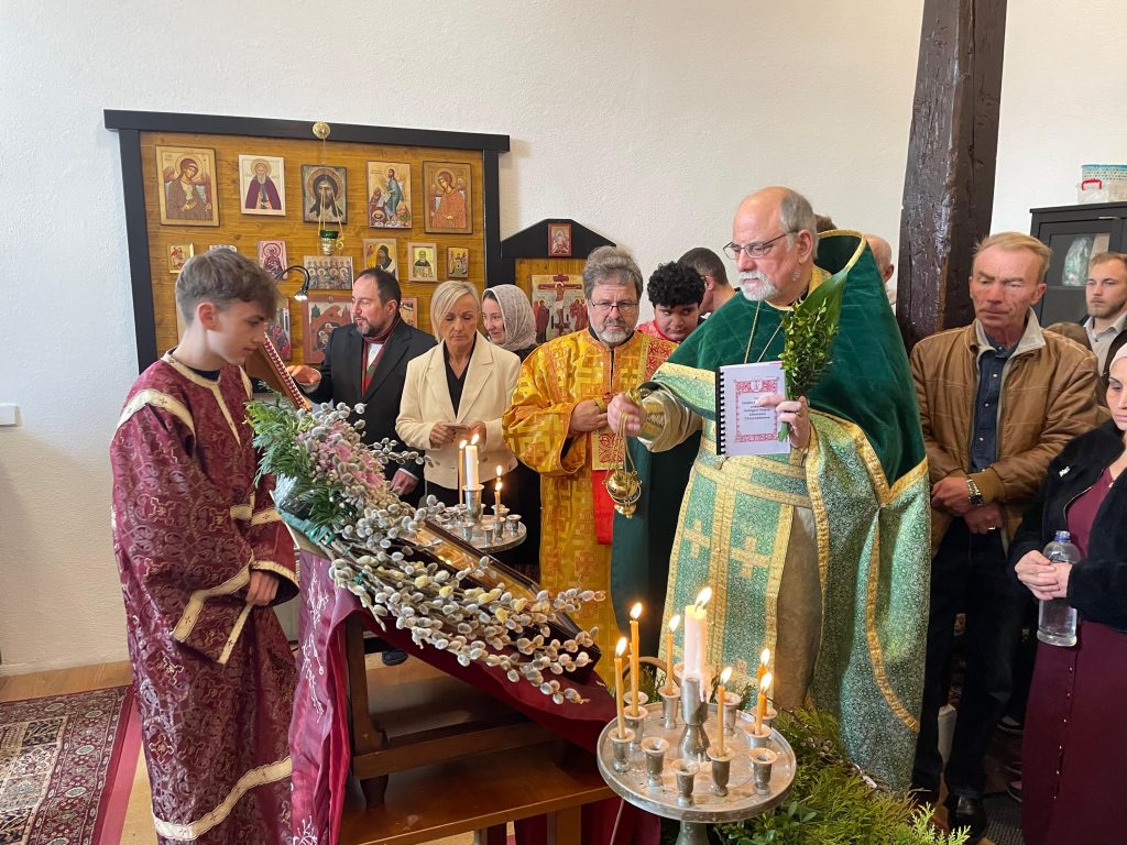 Mit Dir begraben in der Taufe, / Christus, unser Gott, / werden wir des unsterblichen Lebens gewürdigt / durch Deine Auferstehung. / So singen wir in Hymnen und rufen: / Hosanna in den Höhen. // Gepriesen sei, der da kommt im Namen des Herrn.